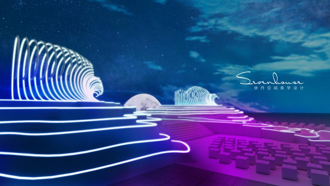 梯台设计灵感来源于婚纱的裙摆,整个梯台联通主舞台的镜面通道犹如一个月亮女神穿起了美丽的婚纱